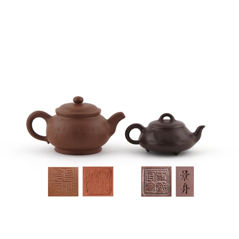 Two Yixing teapots and covers 20th century, one chocolate brown and raised on three small feet, incised with calligraphy and two quail beneath palm fronds, the other with bamboo and calligraphy, impressed marks to the bases and to the covers, 18cm max. The latter in a fitted box with a certificate and photograph of the potter. (5)