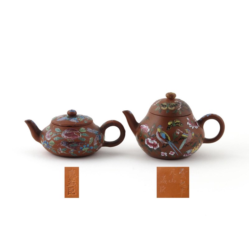 Two miniature Yixing enamelled teapots and covers 19th century, painted with birds and butterflies amidst flowers, one with a three column script mark, the other with a three character mark, some damages to the covers, 11cm. (4)