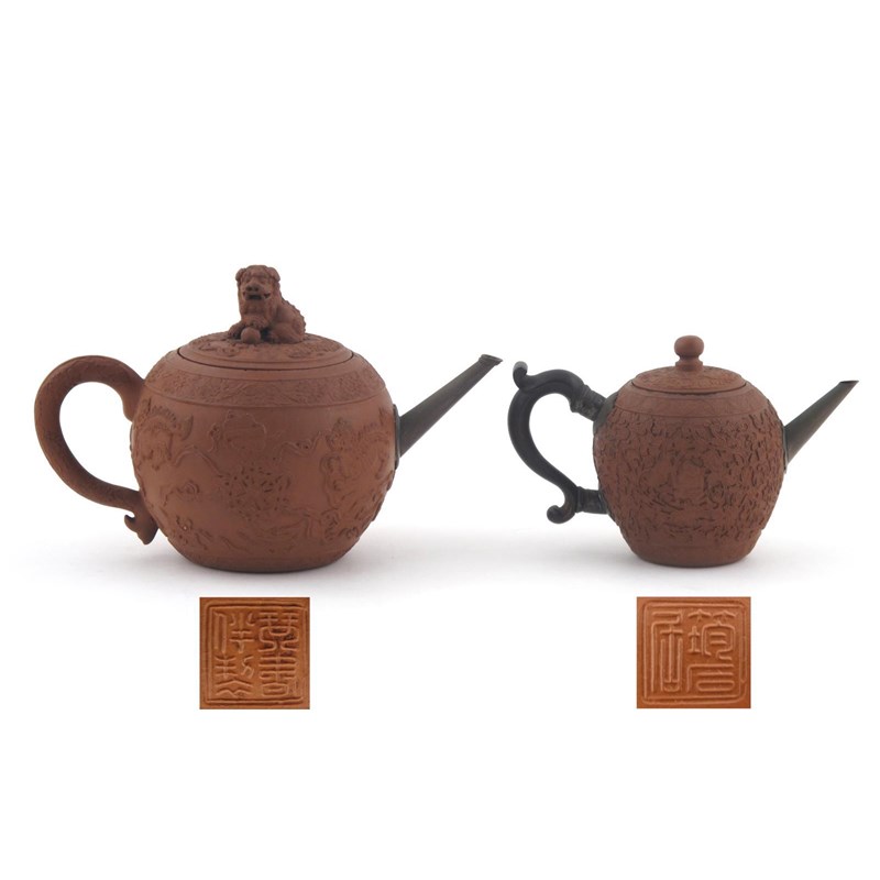 Two Yixing teapots and covers 18th century, the larger applied with lion dogs and auspicious objects beneath a floral border, the smaller with a dense design of tribal figures amongst scrolling foliage, impressed marks to both, replacement spouts, one with a replacement handle, 22.5cm max. (4)