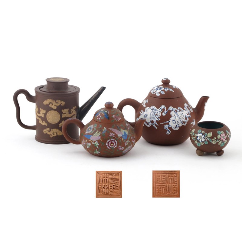 Two pear-shaped enamelled Yixing teapots and covers, and a small tripod bowl, variously painted with birds, butterflies, flowers and tied scrolls, and a cylindrical Yixing teapot and cover applied in buff clay with shou characters and stylized dragons, the latter with damages, 19cm max. (7)