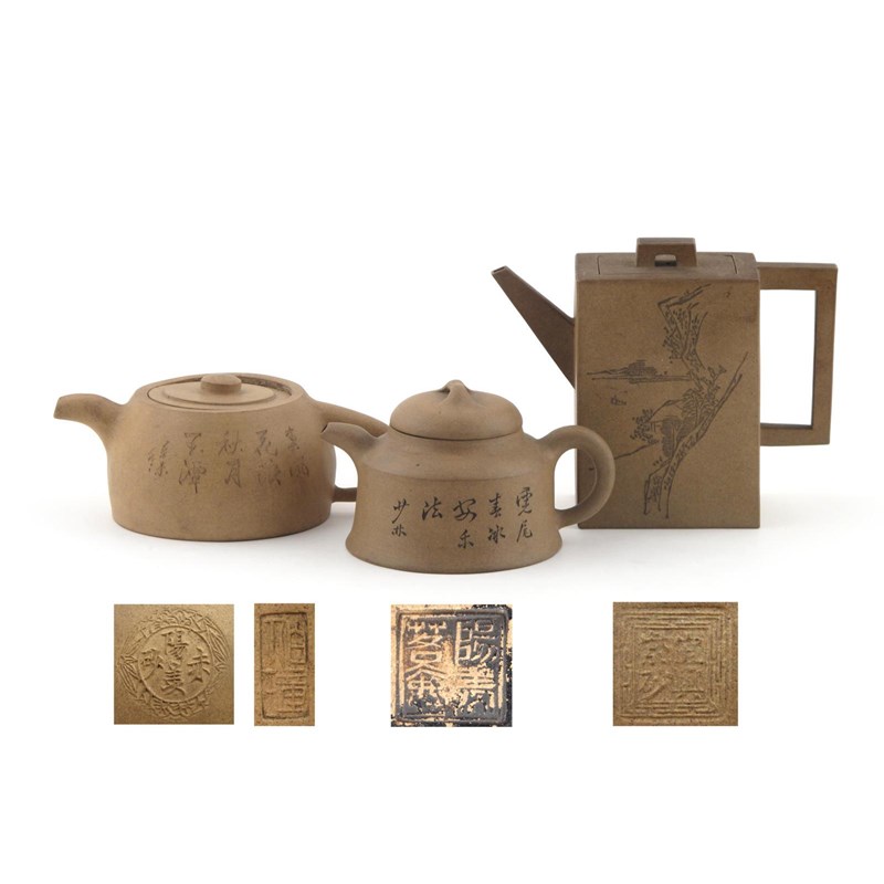 Three Yixing duanni teapots and covers 19th century, variously incised with landscapes, flowers and calligraphy, impressed marks to all, 19cm max. (6)