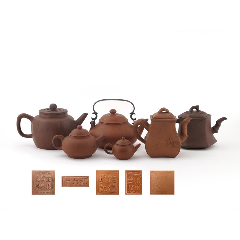 Six Yixing teapots and covers, one with a liner, one miniature, one with an overhead metal handle, and two applied with bamboo, pine and prunus, various marks, 23cm max. (13)