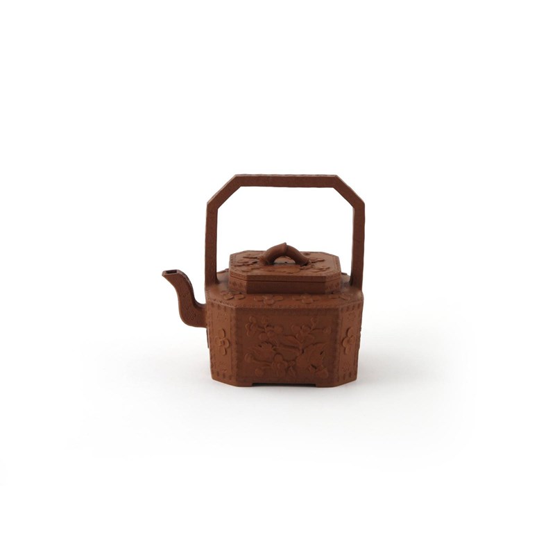 A rectangular Yixing teapot and cover 18th century, with chamfered corners, applied with blossom branches and shou characters, the overhead handle impressed with flowerheads, 12.5cm. (2)