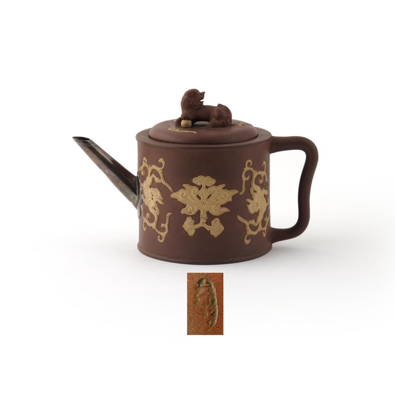 A cylindrical Yixing teapot and cover mid 18th century, applied in cream clay with mythical beasts around a central motif, the cover with a lion dog finial, replacement metal spout, 18cm. (2)