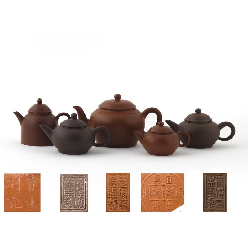 Five small Yixing teapots and covers 20th century, four globular and one bell-shaped, various impressed and incised marks, 15.5cm max. (10)