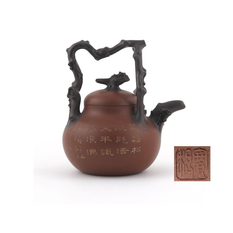 A large Yixing teapot and cover 2nd half 19th century, by Shi Qian, decorated with calligraphy beneath a tall overhead handle modelled as gnarled twigs, impressed mark to the cover and one to the base of the handle, 23cm. (2)