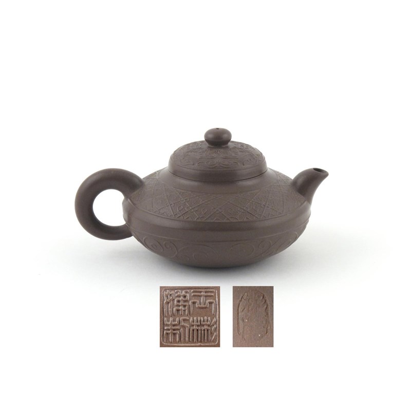 A small Yixing teapot and cover modern, by Yang Qinfeng and Wang Shengdi, moulded after an ancient bronze vessel, impressed seal mark to the base and cover, 15cm. (2)