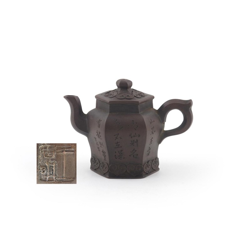 A hexagonal Yixing teapot and cover dated 1874, by Wang Shi Qi, the undulating sides incised by Jia Xu with a landscape scene, the reverse with calligraphy, all above a band of ruyi heads, 16.5cm. (2)