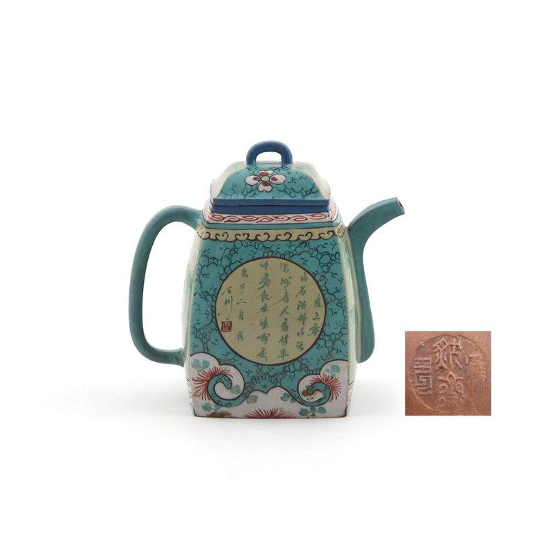 A fine enamelled Yixing teapot and cover late 18th century, the square section body tapering towards the neck, one side decorated with a roundel of fish, the reverse with calligraphy, all above crashing waves, circular impressed mark to the base, 19.5cm. (2)
