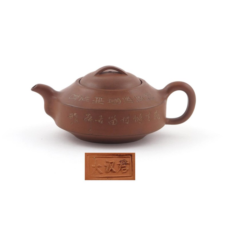 An Yixing teapot and cover early 20th century, the flattened circular form incised with calligraphy and a sprig of prunus, the base with a three character mark, 18.7cm. (2)