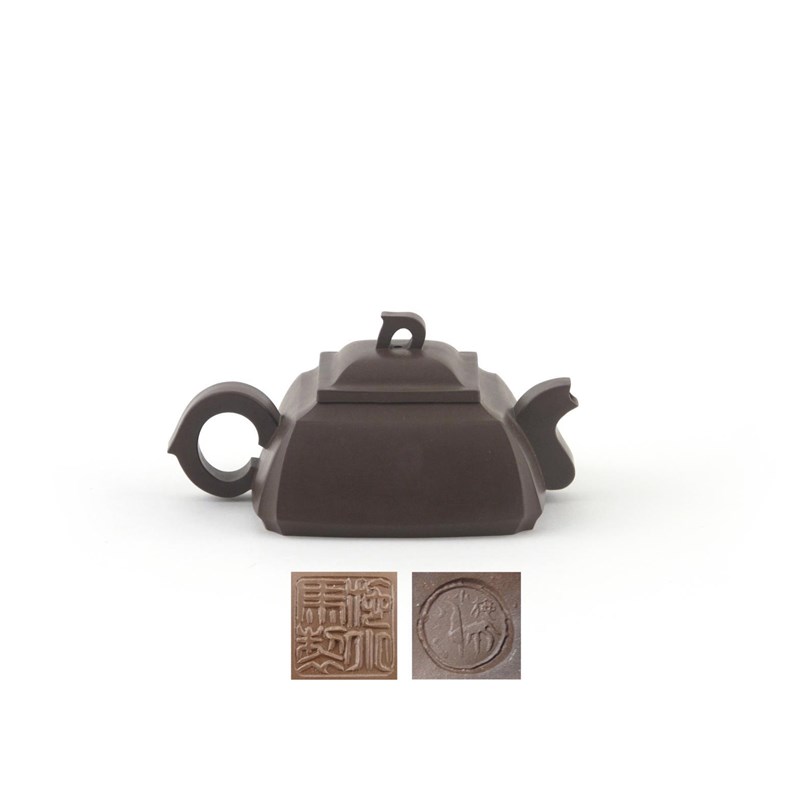 A small Yixing teapot and cover 20th century, by Shi Xiaoma, the body flattened square-section with chamfered corners, impressed four character mark to the base, the cover with a further impressed mark, 14cm. (2)
