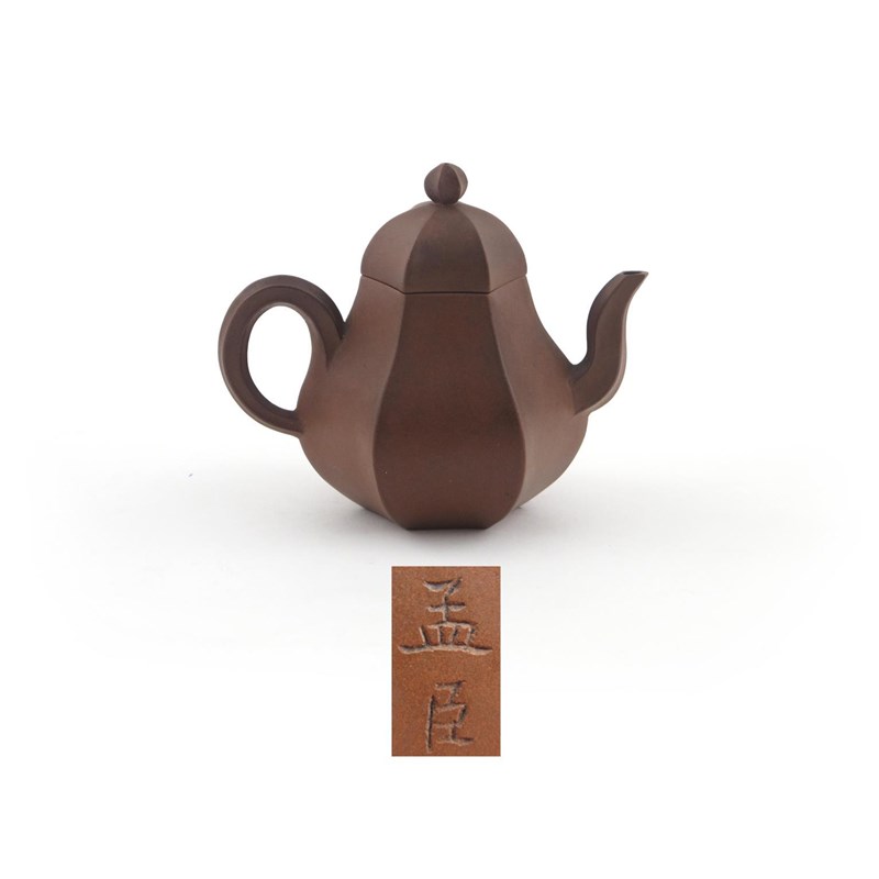 A small hexagonal Yixing teapot and cover late 18th / early 19th century, by Hui Mengchen, the pear-shaped body elegantly defined, two character incised mark to the base, 11cm. (2)