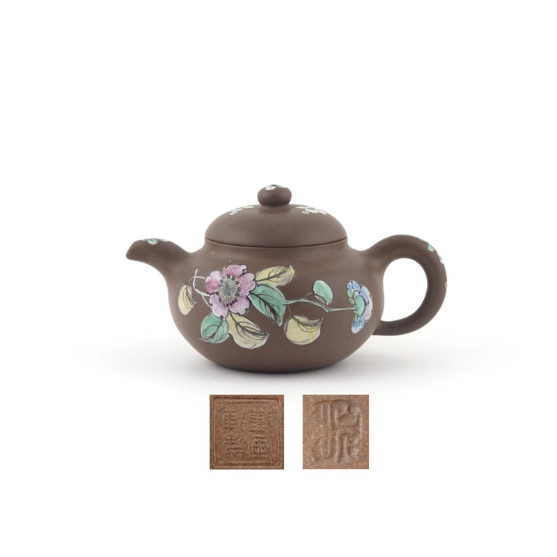 An enamelled Yixing teapot and cover early 20th century, painted with polychrome flower sprays, the cover, handle and spout picked out with white and green flowerheads, impressed mark for Tiehua Xian Company Shanghai, 19cm. (2)