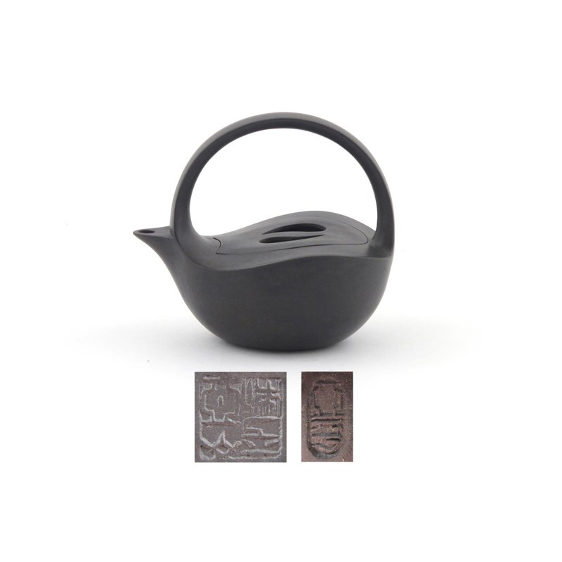 An unusual Yixing teapot and cover modern, by Ding Yaping, the rounded duanni body covered with a dark green wash beneath an overhead handle, impressed marks to the base, cover and handle, 13cm. (2)