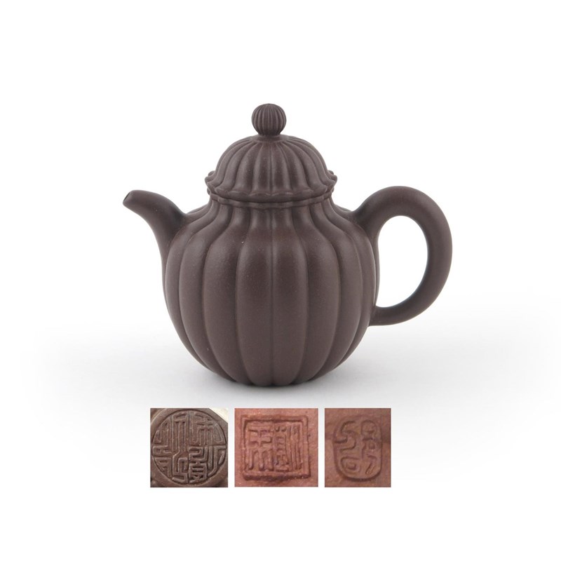 An Yixing chrysanthemum teapot and cover modern, by Shao Shunsheng, the dark body evenly fluted, circular mark to the base, the cover with two further impressed marks, 15cm. (2)
