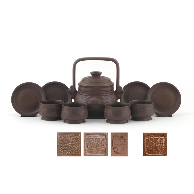 A good Chinese Yixing tea set modern, by Yang Qing Fang, after a bronze teapot for Emperor Xun, decorated with mythical masks on a scroll diaper ground. Comprising: a teapot and cover, four teabowls and four saucers, all in a fitted box with certificate. (12)