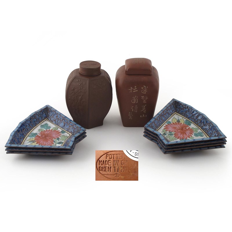 Seven Yixing enamelled supper set dishes 19th century, the dishes painted with chrysanthemum and peony, three from one supper set and four from another, an Yixing tea canister and cover incised with flower sprays and calligraphy, and a modern Meissen hexagonal tea canister and cover, 13cm max. (11)