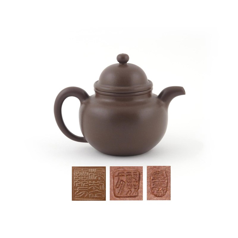 An Yixing Ming-style teapot modern, by Yang Qinfang, the traditional shape a rich muddy brown with a textured finish, impressed seal mark to the base, further marks to the cover and handle, 18cm. (2)
