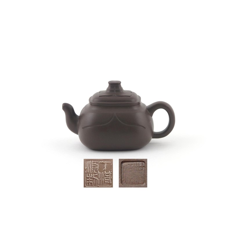 An Yixing teapot and cover modern, by Ding Hongshun, the rectangular section body moulded with lotus petals, impressed marks to the base, handle and cover, 15cm. (2)