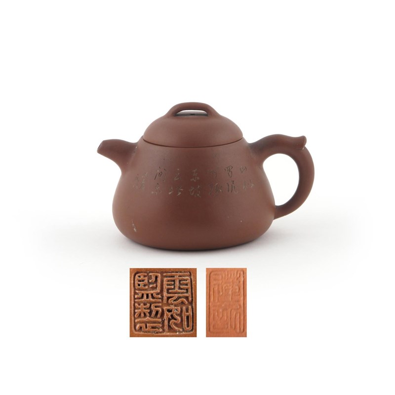 An Yixing teapot and cover 19th century, the pear-shaped body incised with calligraphy, the reverse with stems of bamboo, impressed marks to the cover and base, 16cm. (2)