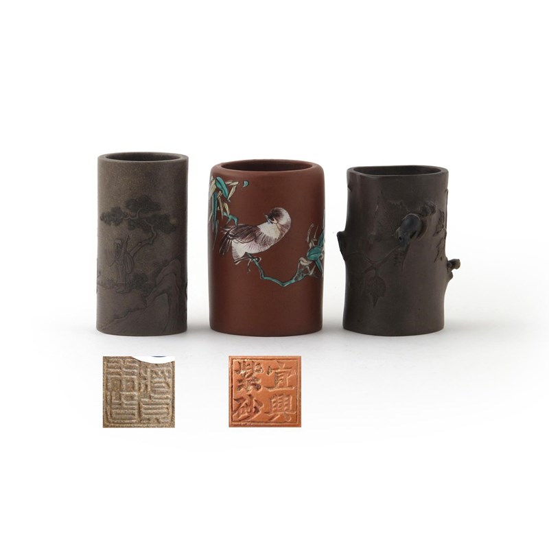 Three Yixing brushpots 18th / 19th century, one modelled as a tree trunk and applied with squirrels and leaves, one decorateds with Shoulao beneath a pine tree, the third enamelled with a bird perched on bamboo, the reverse with calligraphy, seal marks to two, 11.1cm max. (3)