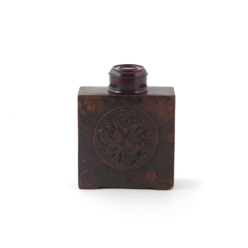 An Yixing flattened square flask 17th / 18th century, one side decorated with a roundel of cranes in flight, with a later wood cover, 20cm.