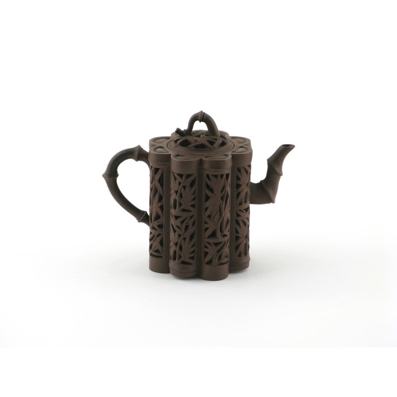 An unusual Yixing octagonal teapot and cover 1st half 18th century, modelled with eight reticulated bamboo poles, pierced with a bamboo design, the handle broken off and well restored, 15cm. (2)