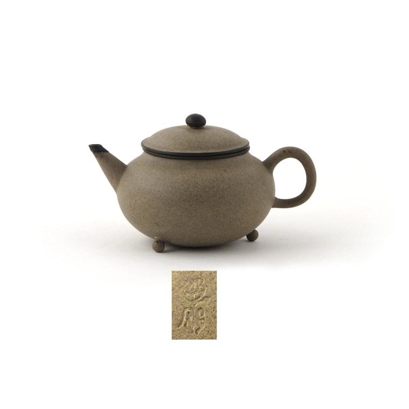 A small Yixing teapot and cover late 19th / early 20th century, for the Thai market, the speckled duanni body raised on three ball feet, the neckrim, cover, finial and spout with metal mounts, impressed Thai characters to the base and cover, 12.2cm. (2)