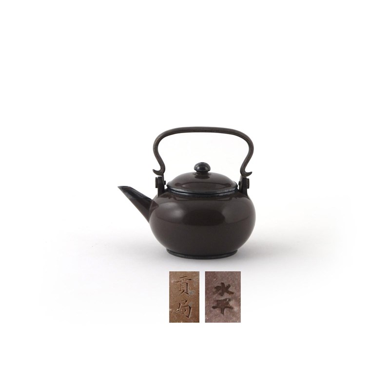 A small Yixing teapot and cover 19th century, for the Thai market, the exterior polished to a high shine, fitted with silvered metal bands to the rim, cover, footrim, finial and spout, two character Gonju mark to the base, shuiping mark to the cover, 9.2cm. (2)