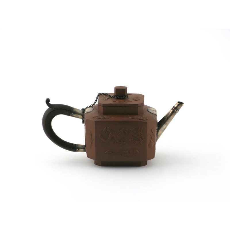 A square-section Yixing teapot and cover late 17th / early 18th century, the body with chamfered corners and applied with dragons chasing flaming pearls amidst ruyi cloud scrolls, replacement spout and handle, 22cm. (2)