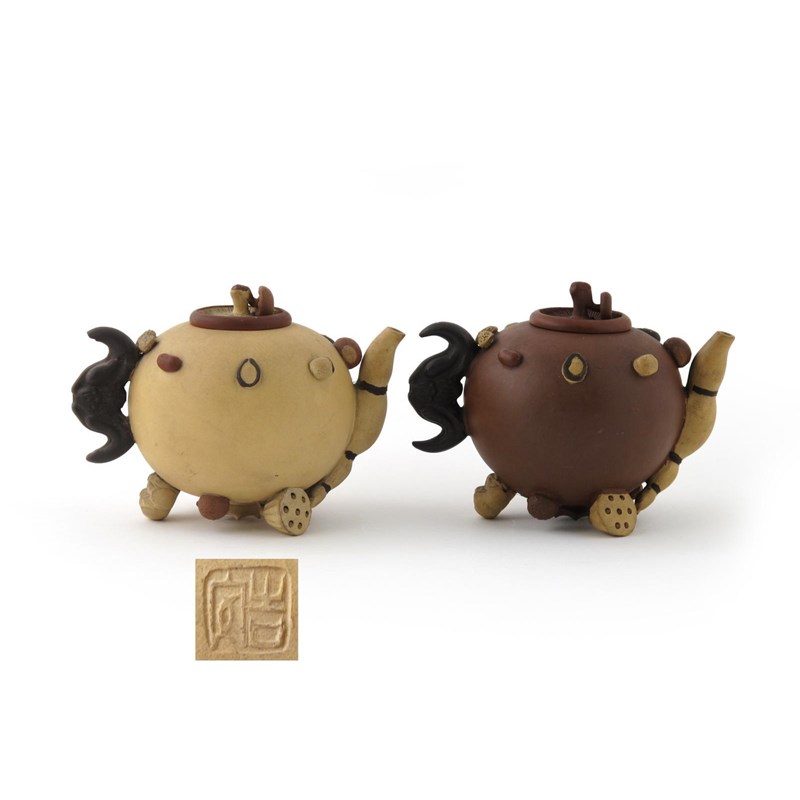 Two Yixing teapots and covers 19th century, applied with a band of seeds and nuts around the shoulders, the feet formed from seed pods and further nut clusters, the covers modelled as mushrooms, 17cm max. (4)