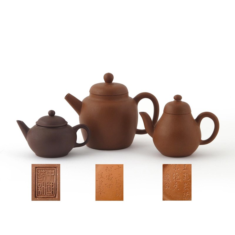 Three small Yixing teapots and covers 19th / 20th century, two brick red with incised marks, the other darker brown with an impressed mark, 13.5cm max. (6)