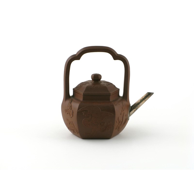 A hexagonal Yixing teapot and cover late 17th / early 18th century, the sides applied with phoenix, deer, lotus and cloud scrolls beneath an overhead handle, replacement metal spout, 17cm. (2)