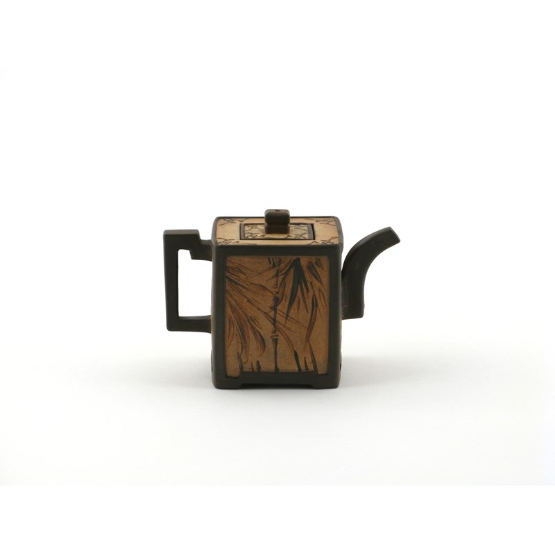 A small square Yixing teapot and cover 1st half 19th century, each side painted with bamboo and other foliate motifs in chocolate brown on a pale creamy orange ground, 14cm. (2)