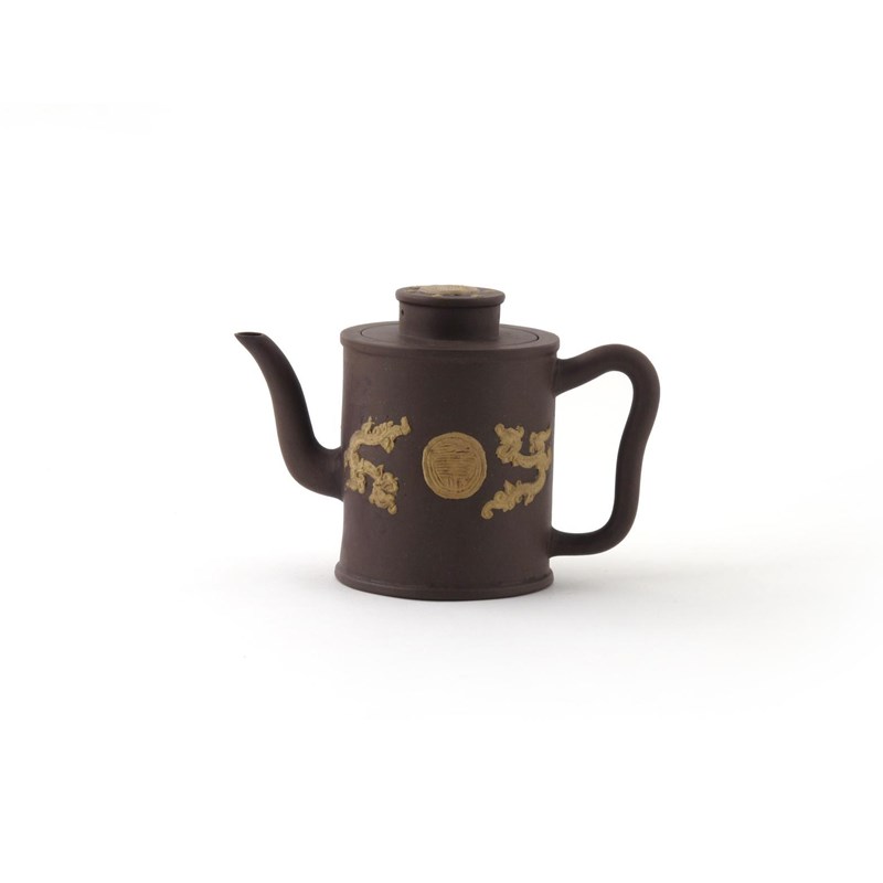 A cylindrical Yixing teapot and cover 18th century, each side applied with cream with two stylized dragons around a central shou character, the cover with a circular knop, unmarked, some restoration to the cover and spout, 18.5cm. (2)