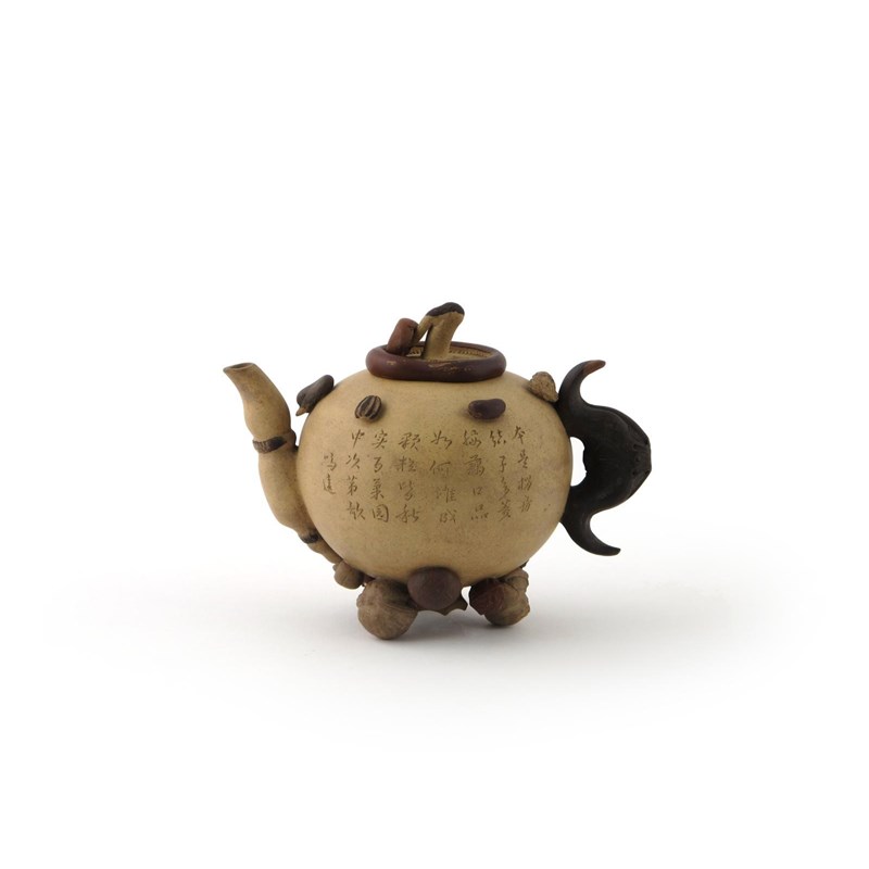 A small Yixing teapot and cover 19th century, the duanni type body applied with seeds and nuts around the shoulders, handle and footrim, the cover formed as an inverted mushroom, 16cm. (2)