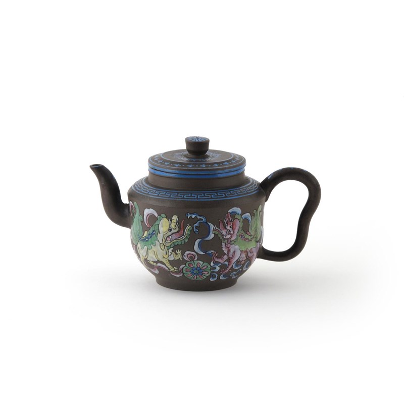 An enamelled Yixing teapot and cover 18th century, each painted in fine detail with two lion dogs playing with a ribboned brocade ball, beneath a geometric blue border, 21.5cm. (2)