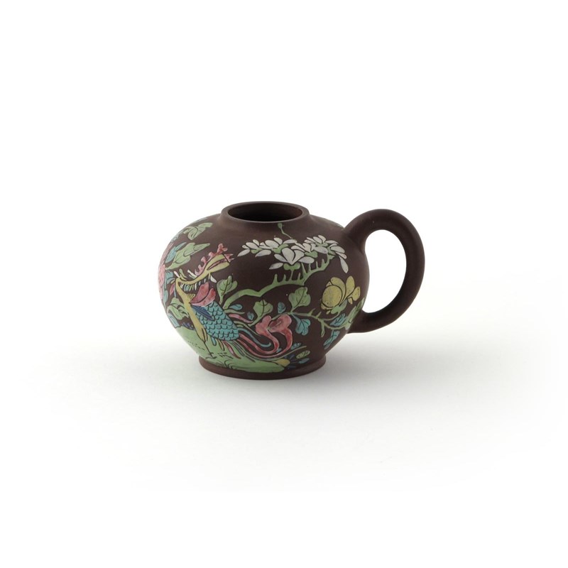 An unusual Yixing one-handled jar 19th century, the globular body enamelled with a phoenix standing amongst native flowers, the cover lacking, 14.5cm.