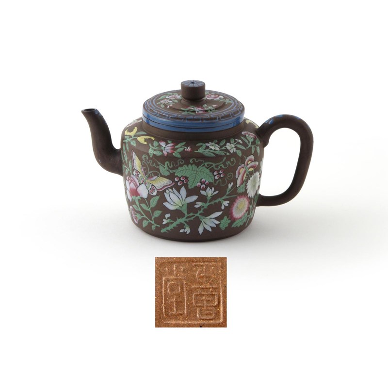 An enamelled Yixing teapot and cover 18th century, boldly painted with an allover design of butterflies amidst various flowers, vine and foliage, impressed seal mark to the base, 21.5cm. (2)