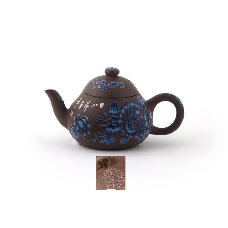 A small Yixing teapot and cover 19th / 20th century, enamelled with blue flowers and with a row of white calligraphy, circular seal mark to the base, the cover with a painted mark, 13cm. (2)