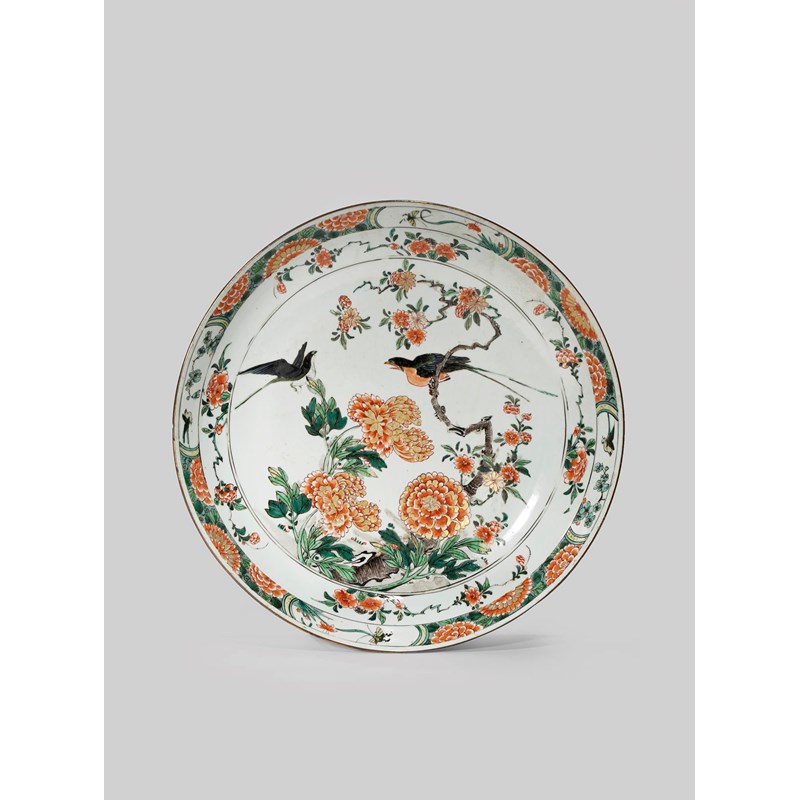 A CHINESE FAMILLE VERTE DISH KANGXI 1662-1722 Painted to the well with a circular panel...