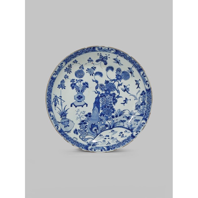 A LARGE CHINESE BLUE AND WHITE DISH KANGXI 1662-1722 Painted with aquatic birds standing at the...