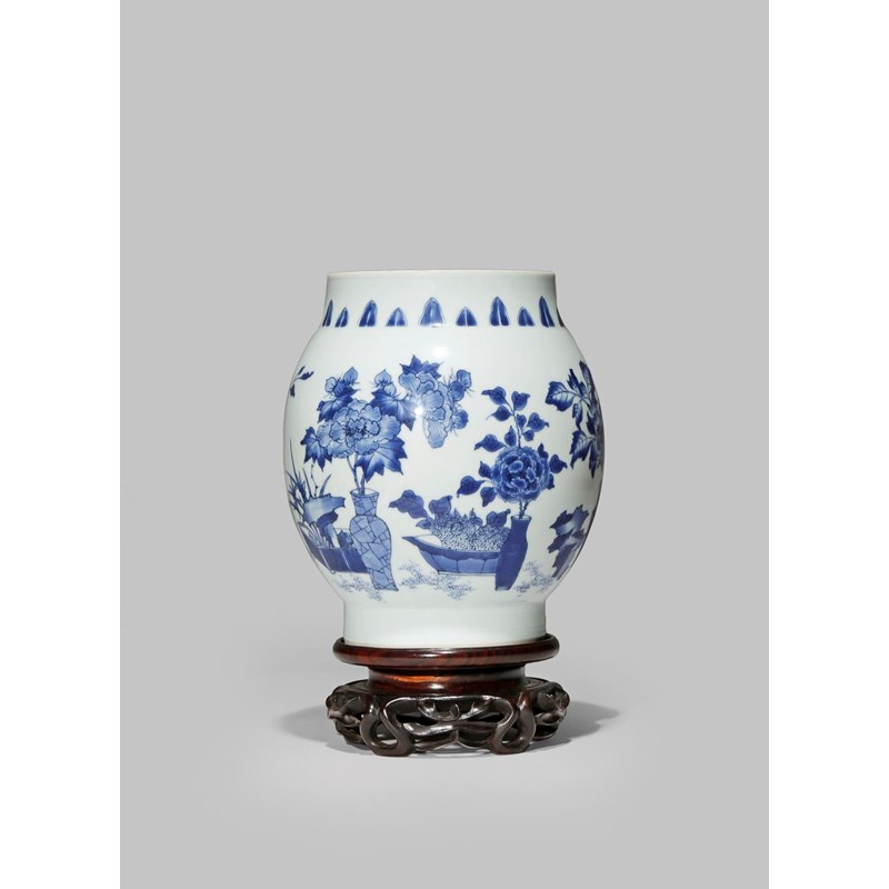 A CHINESE BLUE AND WHITE OVOID VASE C.1640 Painted with vases and jardinières containing...
