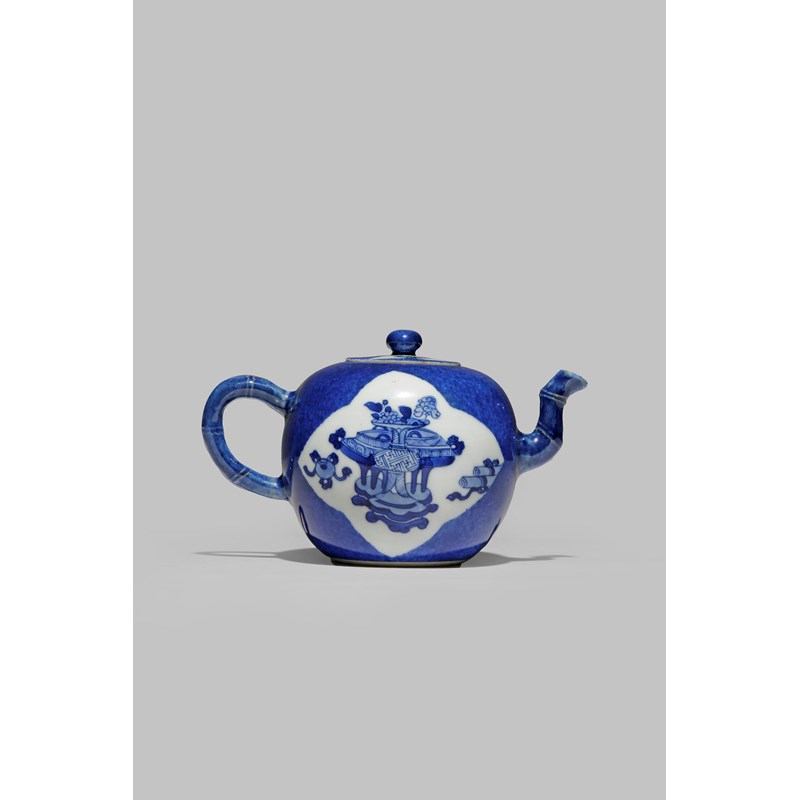 A SMALL CHINESE BLUE AN WHITE TEAPOT AND COVER KANGXI 1662-1722 Decorated with two panels of...
