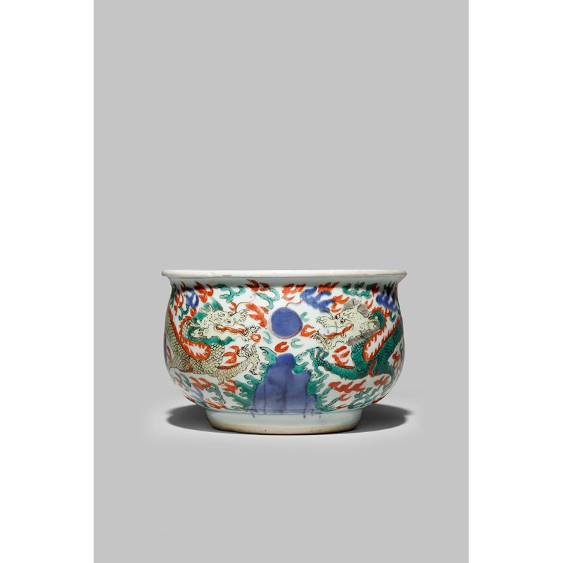 A LARGE CHINESE WUCAI INCENSE BURNER C.1640 Painted to the exterior with two dragons and flaming...