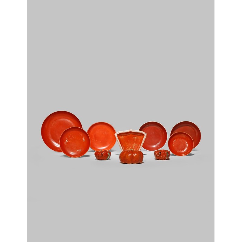 A SMALL COLLECTION OF CHINESE CORAL GLAZED ITEMS QING DYNASTY Comprising a pair of water droppers...