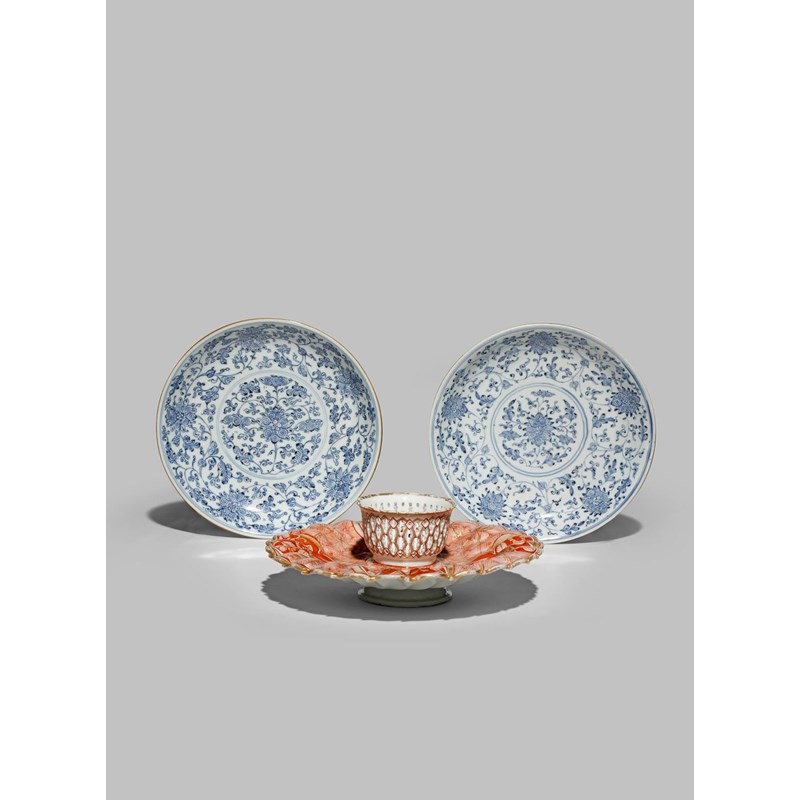 Each decorated with lotus and the back celadon-glazed, together with an iron-red and gold decorated moulded stand, 22cm. (3)
