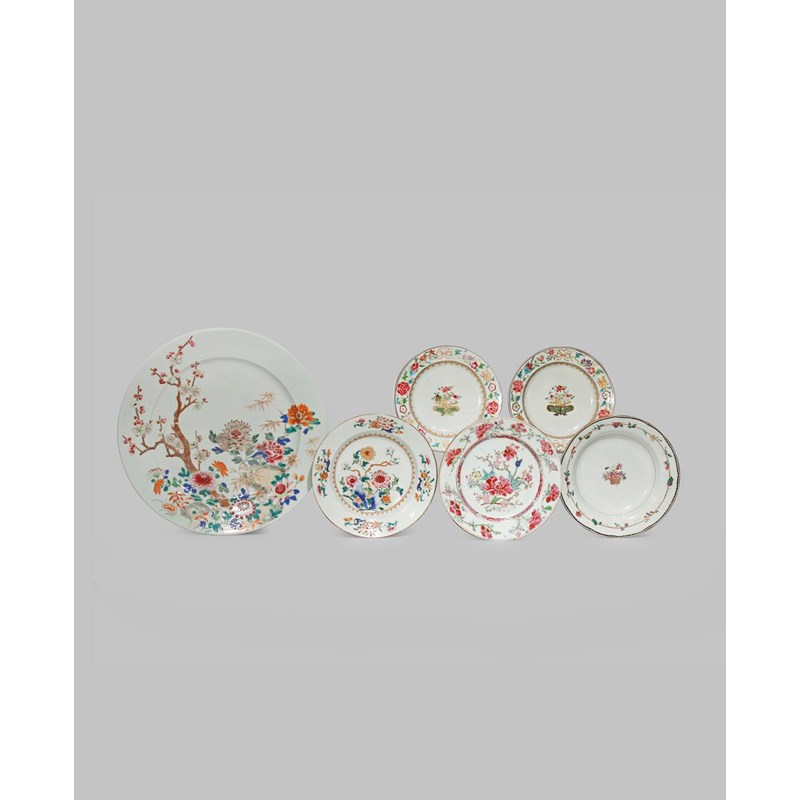 Painted with prunus, peony and bamboo, three further plates and two soup plates, 37.5cm max. (6)