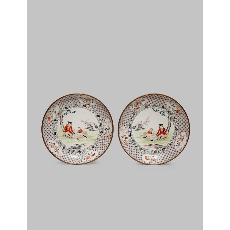 A PAIR OF CHINESE CANTON ENAMEL FAMILLE ROSE DISHES 19TH CENTURY The centre painted with a...
