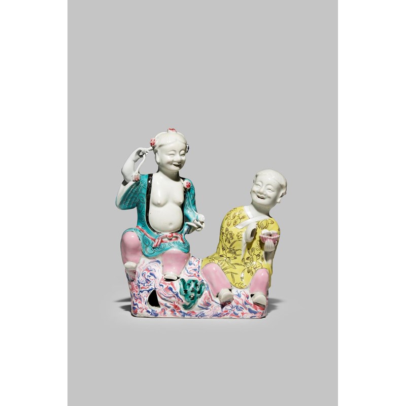 A CHINESE FAMILLE ROSE MODEL OF THE HEHE ERXIAN 18TH CENTURY The twins seated on colourful rockwork